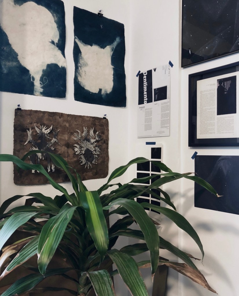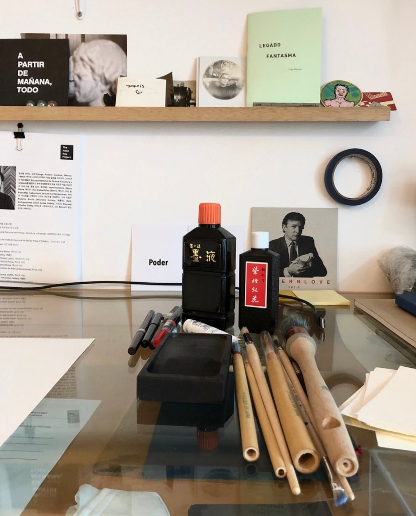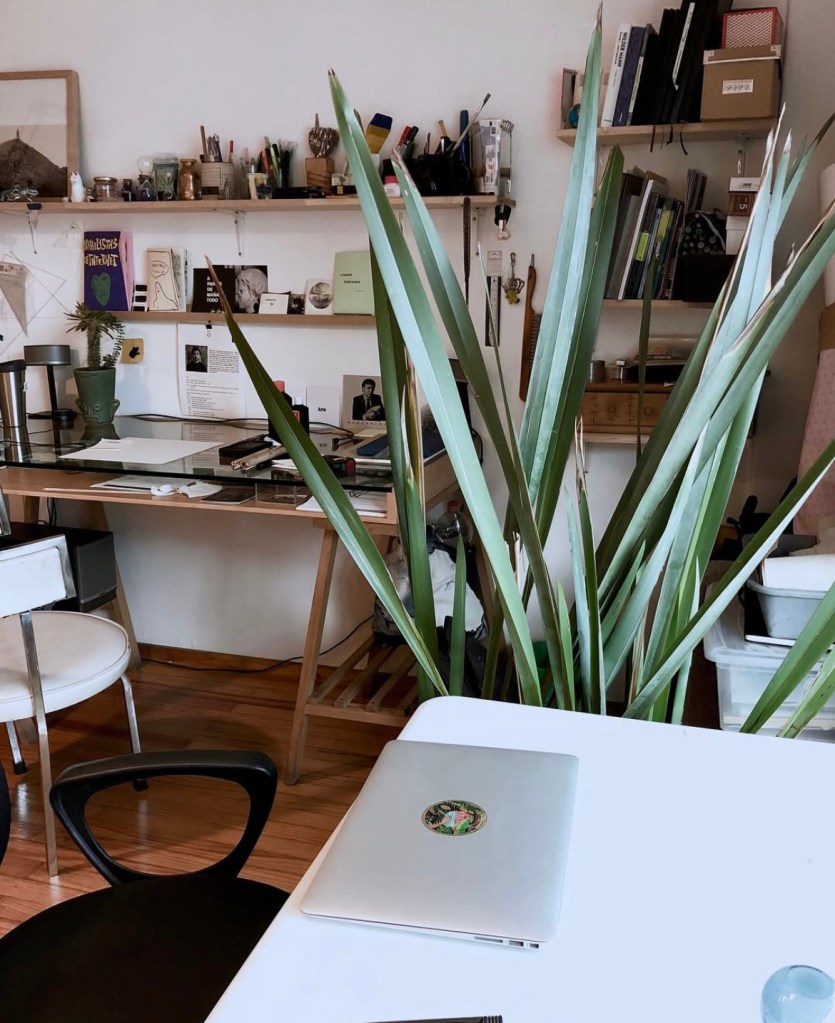 A plant, ink, papers, photographies, laptop