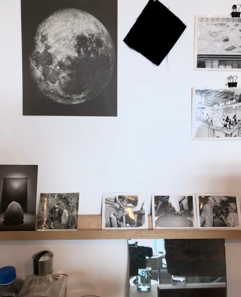 A couple of antique photographs, a drawing, wolfman’s figure collection, humidifier lamp